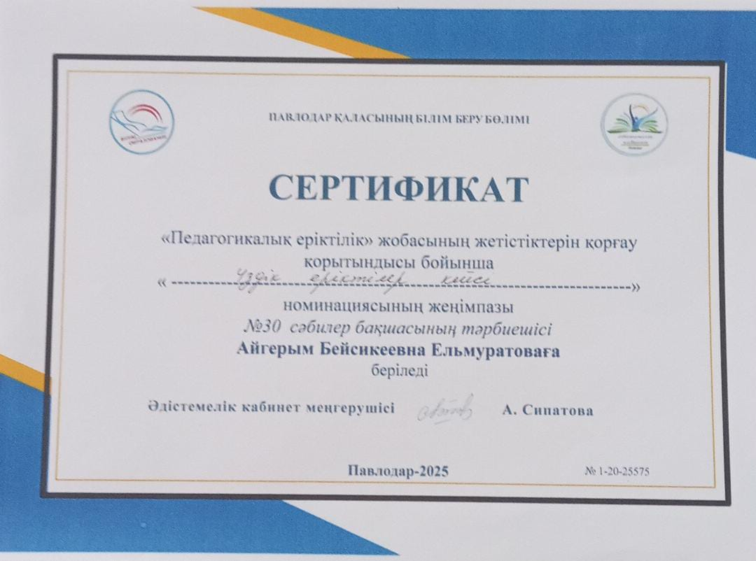 Балабақшамыздың педагогтері Ельмуратова А.Б. және Жунусова Г.М. "Педагогикалық еріктілік" жобасының жетістіктерін қорғау қорытындысы бойынша "Үздік ерітктілер кейсі" номинациясы бо...