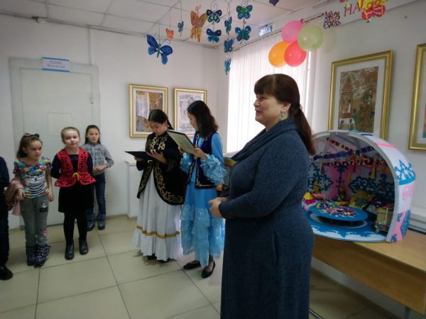Стены выставочного зала украсила выставка работ “Наурыз”, а также нарядные макеты юрт, выполненные руками учащихся и педагогов школы.