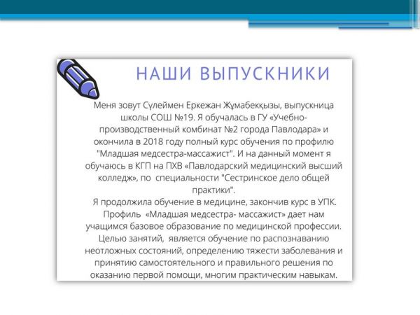 ОӨК-ның түлектері әрқашан өз мұғалімімен байланыста. Олар өздерінің жаңалықтарымен және оқудағы жетістіктерімен бөлісуді ұмытпайды. Көптеген балалар медициналық колледждер мен университеттерде оқиды.