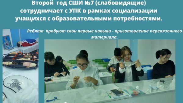 №7 АМИ (көру қабілеті бұзылған) білім беру қажеттіліктері бар оқушыларды әлеуметтендіру аясында ОӨК-мен екінші жыл ынтымақтасуда. Балалар өздерінің алғашқы дағдыларын - таңғыштарды дайындауды сынап көрді. Басқа арналған таңғыш «қалпақ» (чепец).