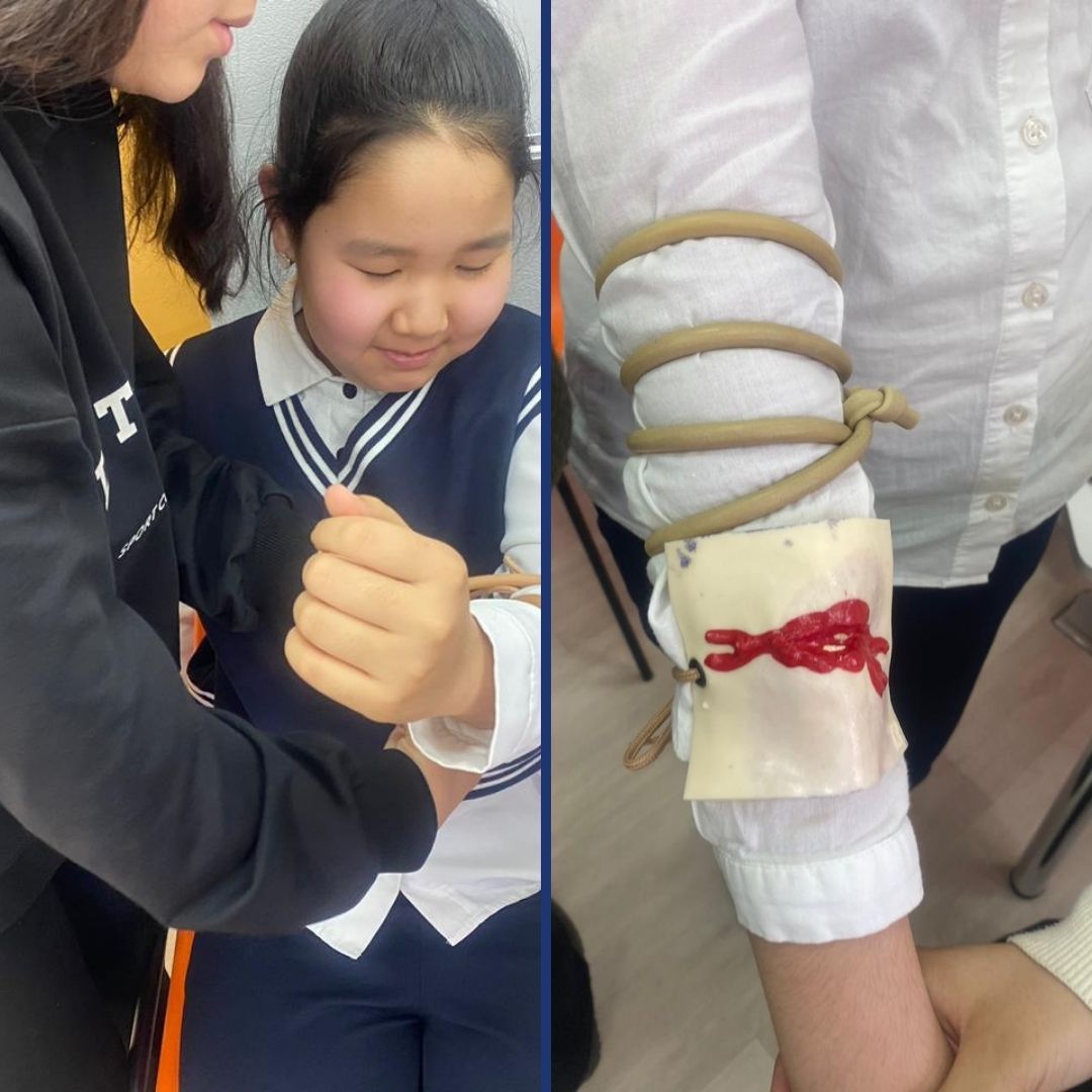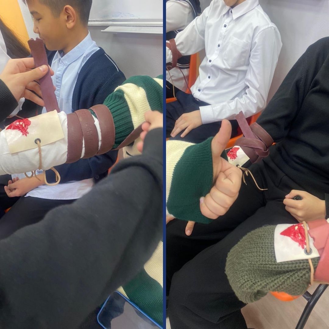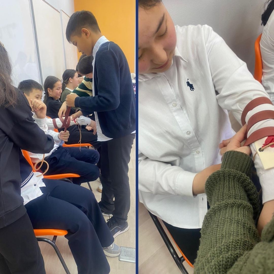 Қ. Беққожин атындағы мектептің 7 сынып оқушылары қан кету кезінде медициналық көмек көрсетуді үйренуде.