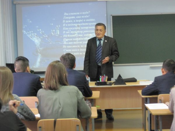 Оқушыларға презентация ұсынылып келесідей сұрақтар қойылды: жер бетінде өмір үшін судың маныздылығы, адам ағзасындағы су, судың қызметімен маңыздылығы, су сапасының негізгі көрсеткіштері, судың кен тараған ластағыштары, суды тұшылау әдістері. Оқушылар қызығушылықпен тындап, маманның сөз сөйлегенінен кейін сұрақтар қойды. Оқушылардың ерекше қызығушылығын тудырған суды қайнамаған түрде пайдалануы болды. Онымен қоса, Қаппас Каримович күзгі мезгілде өзекті орын алатын «ЖРВИ алдын алу» тақырыбын қозғады.