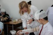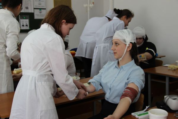 Вторая часть конкурса под названием «Станция скорой помощи» состояла из следующих заданий: сборка шприца и набор лекарственных средств, техника введения (на поролоне) внутримышечных и подкожных инъекций. Ребята должны были показать, как правильно соблюдать правила стерильности и технику инъекции.