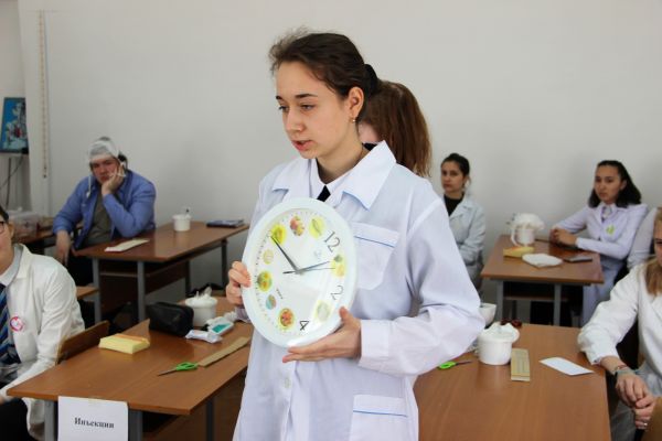 Конкурс начался с задания «Лист назначений врача». Ребята получили бланки с определенными названиями болезней, где нужно было определить признаки заболеваний. Следующее задание «Травмпункт», было на синхронное начало, конкурсанты на своих ассистентах демонстрировали повязку «Чепец».