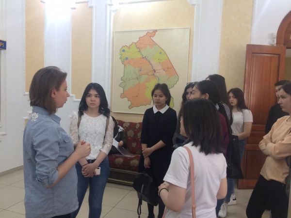 Ең алдымен ол оқушыларды мұражайдың бөлімдерімен таныстырды-