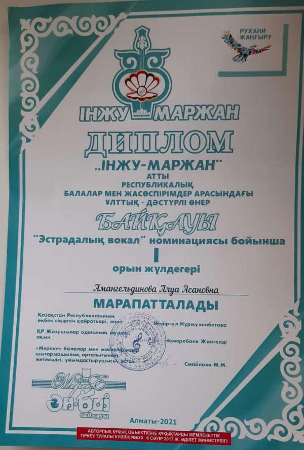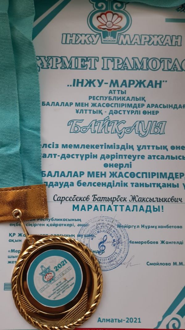 Байқау қорытындысы бойынша "Қасиетті домбыра" әнін орындағаны үшін "Эстрадалық вокал" номинациясында I ОРЫН иеленіп, I дәрежелі медальмен және дипломмен марапатталды. Клубтың ұстазы Сарсебеков Батырбек Жақсылықұлы Құрмет грамотасымен марапатталды. Құттықтаймыз.