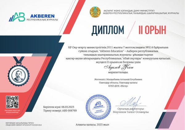 Қаңтар -ақпан айында “Akberen Education” – Ақберен республикалық танымдық-шығармашылық журналы ұйымдастырған Республикалық «Абай оқулары» конкурсы нәтижесінде "Таңшолпан" үйірмесінің тәрбиеленушісі Адилов Жан 2 жүлделі орынға ие болды.  Ал жетекшісі Алтынай Егеубайқызы жеңімпаз тәрбиелеп, белсенділік танытып, алғыс хатпен марапатталды. Зор денсаулық, келешекте шабыт пен шығармашылық тілейміз, жарайсыңдар!