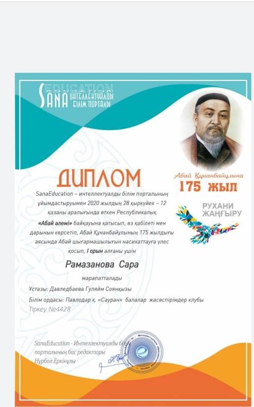 онлайн байқауына "Сауран" балалар жасөспірімдер клубынан Рамазанова Сара ( 6 жас) қатысып 2 жүлделі орын алды, үйірме жетекшісі Г.С. Давледбаева. ҚҰТТЫҚТАЙМЫЗ.  SANA education – интеллектуалды білім порталы өткізген ХІІ Республикалық «Абай әлемі» мәнeрлeп оқу онлайн  байқауына "Сауран" балалар жасөспірімдер клубынан Рамазанова Сара ( 6 жас)  қатысып 1 орын алды, үйірме жетекшісі -  Г.С.Давледбаева.