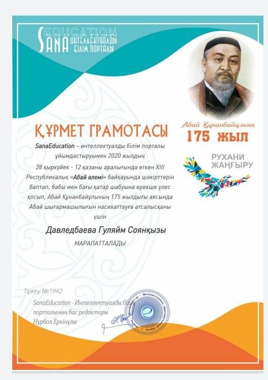 SANA education – интеллектуалды білім порталы өткізген ХІІ Республикалық «Абайға хат» атты көркeм жазу (каллиграфия)
