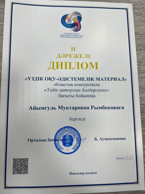 2022 жылы 23 тамызда  Павлодар облысының  педагогикалық қызметкерлерінің "Білімберудегі  маңызды  құндылықтарды;терең  білім, еңбекқорлық және патриотизм" тақырыбында  тамыз кеңесінде "Үздік оқу- әдістемелік материал" облыстық конкурсында  "Үздік авторлық бағдарлама" №6 мектепке дейінгі гимназиясының педагог- логопді  Рымбекова  Айымгуль Муктаровна   ІІ дәрежелі ДИПЛОМ марапатталды. Құттықтаймыз !!!