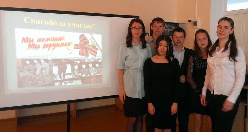 В мероприятии участвовали ученики 9 "Б" класса. Участники показали и закрепили знания о Великой Отечественной войне и о Казахстанских героях. Активное участие приняли Бает Айгерим, Жубанова Валерия, Долгих Елизавета, Толмачев Илья, Корчевская Надежда.