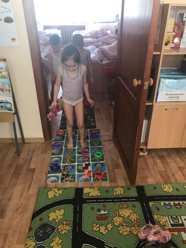 В нашем саду проводятся закаливающие процедуры направленные на укрипление здоровья детей. Одна из них гимнастика пробуждения, которой охотно поделилась с молодыми педагогами воспитатель высшей категории Арынова Қорлан Артанаевна.