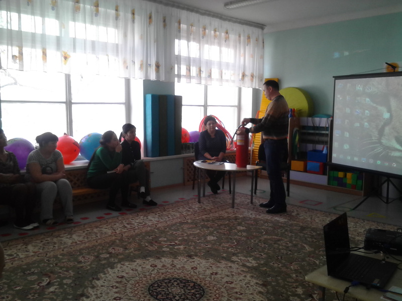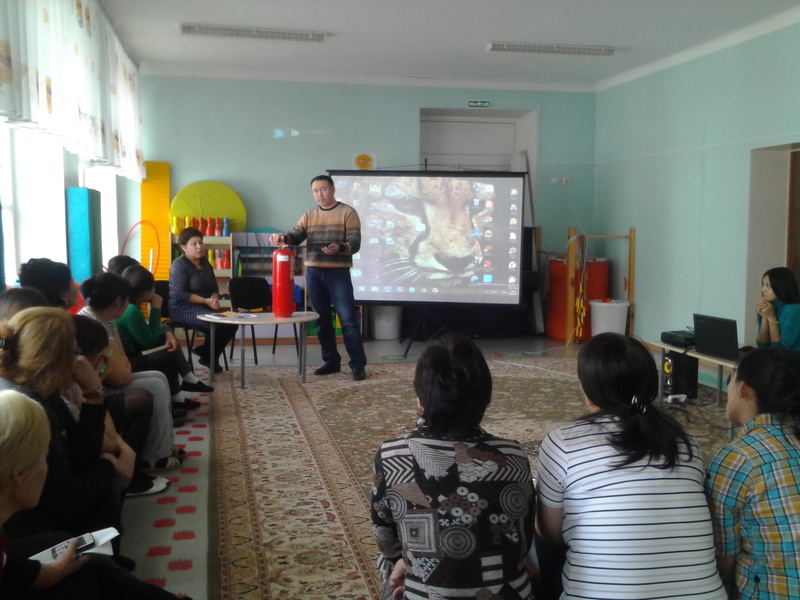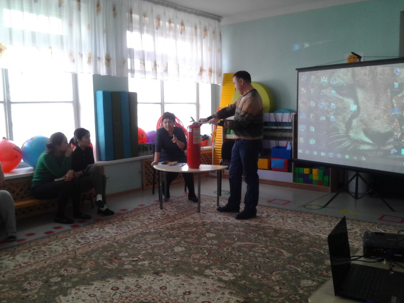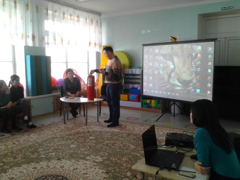 Бүгін бақшамызда балабақша қызметкерлеріне "Өрт қауіпсіздігін алдын алу " тақырыбында практикалық семинар өткізілді. Семинарды Болат Қойшыбайұлы Жумашов өткізді. Алдымен қызметкерлерге өрт кезінде немесе басқа да төтенше жағдайларда алғашқы көмек көрсету жайлы бейне ролик көрсетілді. Шаруашылық жағынан басшының орынбасары және Болат Қойшыбайұлы өрт сөндіру кезіндегі әрекет жайлы, адамдарды эвакуациялау, өрт сөндіргішті қалай қолдану жайлы мағлұмат берді. Қызметкерлер құралды қалай қолдану керектігін практикада пайдаланып көрді.