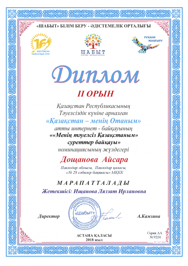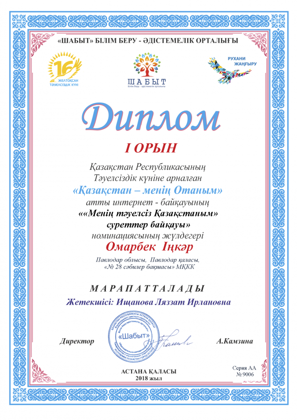 "Қазақстан-менің Отным" атты интернет -байқаудың "Менің тәуелсіз Қазақстаным" сурет байқауы номинациясының жүлдегерлері Омарбек Іңкәр, Дощагова Айсара, Бейсенбенова Айдана.