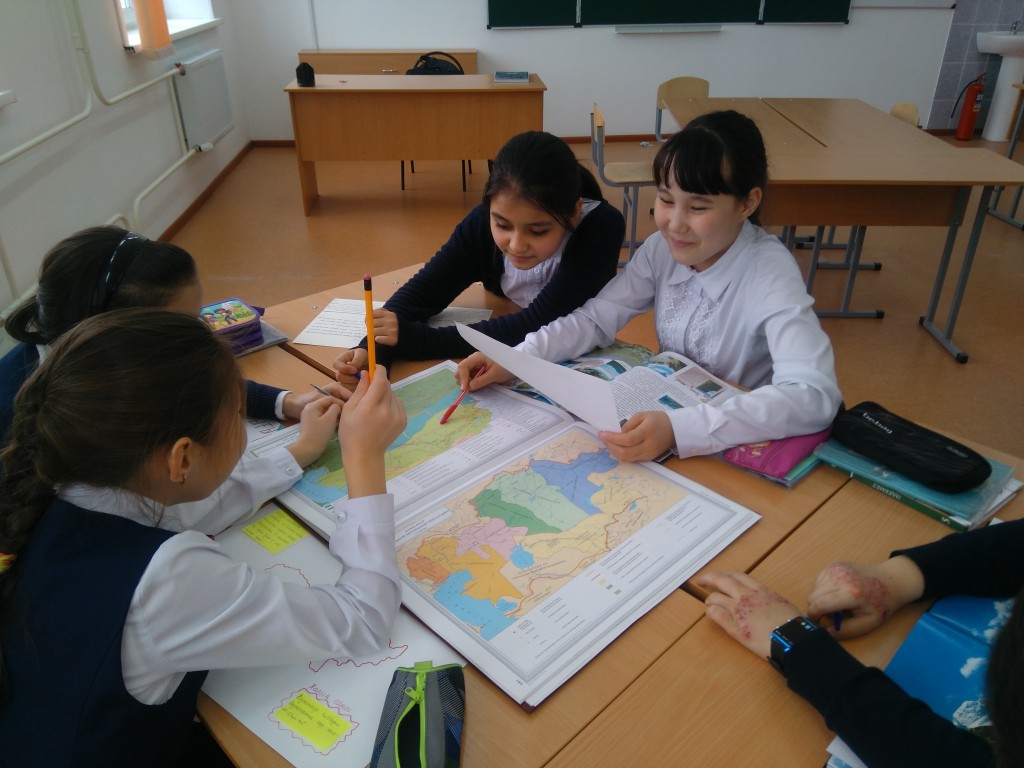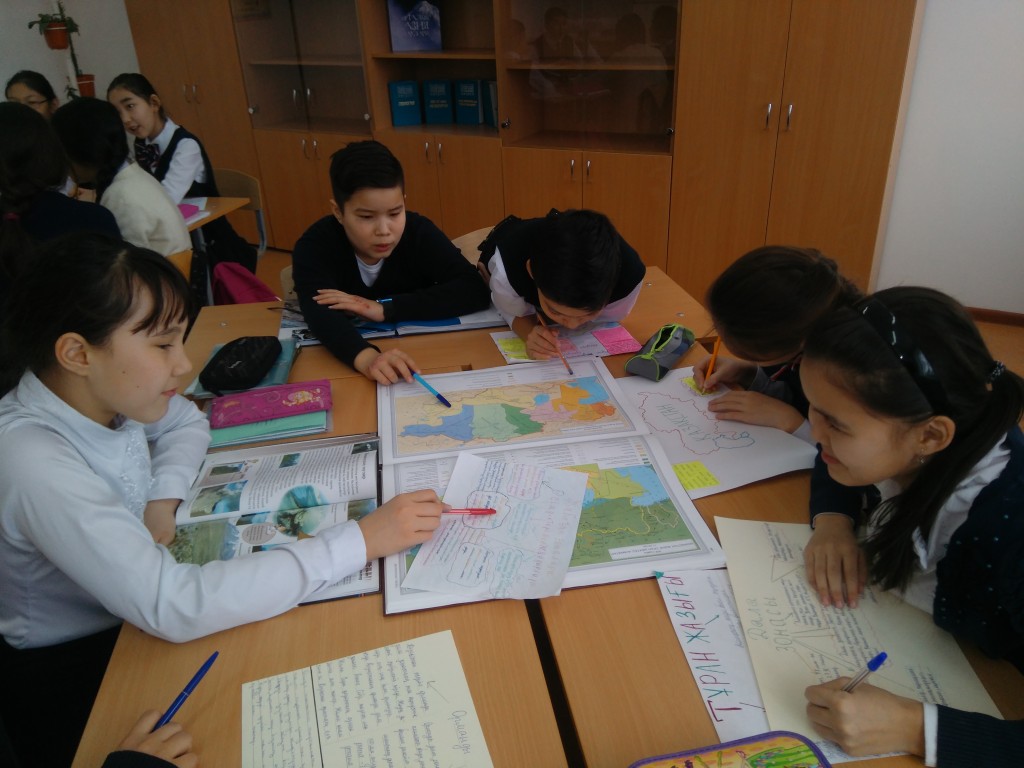 Оқушылар екі топқа бөлінді: I топ – Қазақстанның физикалық картасы, II топ – Қазақстанның саяси картасы. Оқушылар түрлі кітапшалар, атлас, картаны қолданып, топтың атына сәйкес Қазақстанды сипаттап өтті. Сипаттау барысында оқушылар негізгі деген мәліметтерді дәптерлеріне жазып, ал қосымша ретінде шығармашылық қабілеттерін байқау мақсатында сызбанұсқа және сурет салып жұмыстарын толықтырды, бір біріне сұрақ қойып, бірлесе жұмыс істеді. Екі топ жұмыстарын аяқтап болғаннан кейін, әр топтан екі оқушыдан шығып жұмыстарын қорғады, ал қалған топ мүшелері қойылған сұрақтарға жауап беріп отырды. Сабақ соңында, 2 топ мүшелері жұмыстарымен ауысып, бір бірлерін толықтырды. Бағалау екі топ арасында өтті.