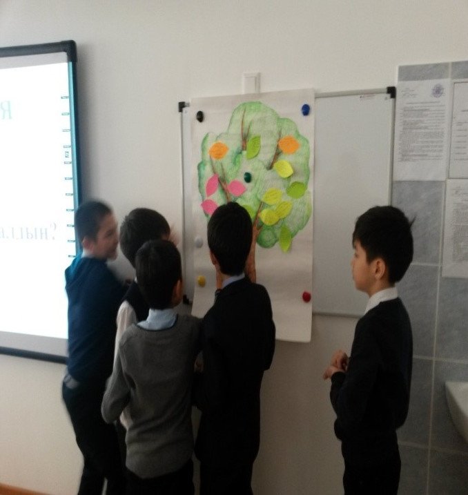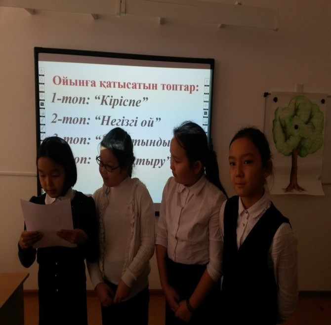 3Топ мүшелері мәтін бөліктерін әңгімелеуді ретімен бастады. "Толықтыру" тобы әрбір топтан кейін сөз алып, толықтырып отырды. Оқушылар пікір таластырып, бір-біріне қарсы сұрақтар қойды. 4 Келесі кезеңде "Екі жақты жазба күнделігі" стратегиясы бойынша берілген кестелерді толтырып, топ мүшелері өз жұмыстарын қорғады. Топтың неғұрам нақты берген жауаптары анықталып, жоғары бағаланды. 5 Сабақ соңында оқушылар алған әсерлерін табыс ағашын көріктендіру арқылы білдірді. Үйге әңгіме мазмұнын ашатын мақал-мәтелдер жазып келу тапсырылды.