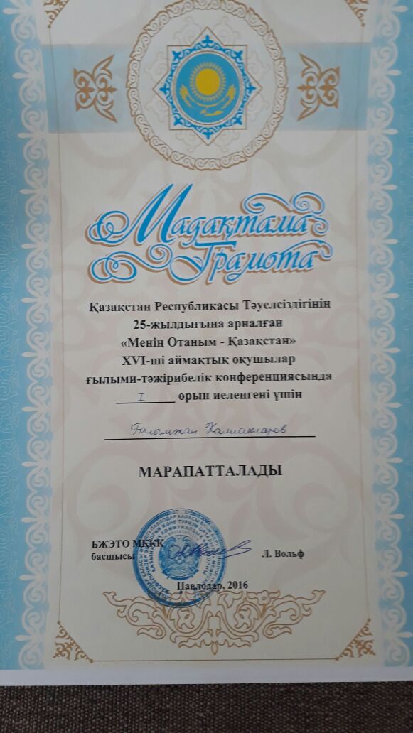 ҚР Тәуелсіздігінің 25 жылдығына арналған "Менің Отаным - Қазақстан" XVI аймақтық ғылыми практикалық конференцияның қорытындысы өтті. 1 орынмен 6 "Д" сынып оқушысы Калиакпаров Ғалымжады құттықтаймыз. Ол– жас зерттеуші, орыс тілінен ғылыми жобаны қорғады. 10 "А" сынып оқушысы Сулейменова Алина "Өзекті" номинациясында атап өтілді. (жетекші Е.В.Немченко)
