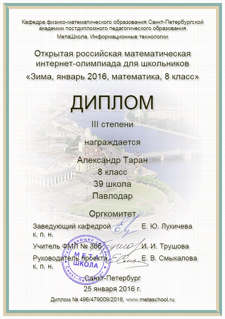 Вчера состоялась открытая российская математическая интернет-олимпиада для школьников «Зима, январь 2016, математика, 8 класс». Приняло участие 5245 учащихся из России и ближнего Зарубежья. Стали победителями и призерами только 1321 учащихся. ТаранАлександр, Айдарханов Адиль, ученики 8 «Б» класса стали призерами по математике. Поздравляем и желаем дальнейших побед! Учитель математики: Лучевникова Т.Г.