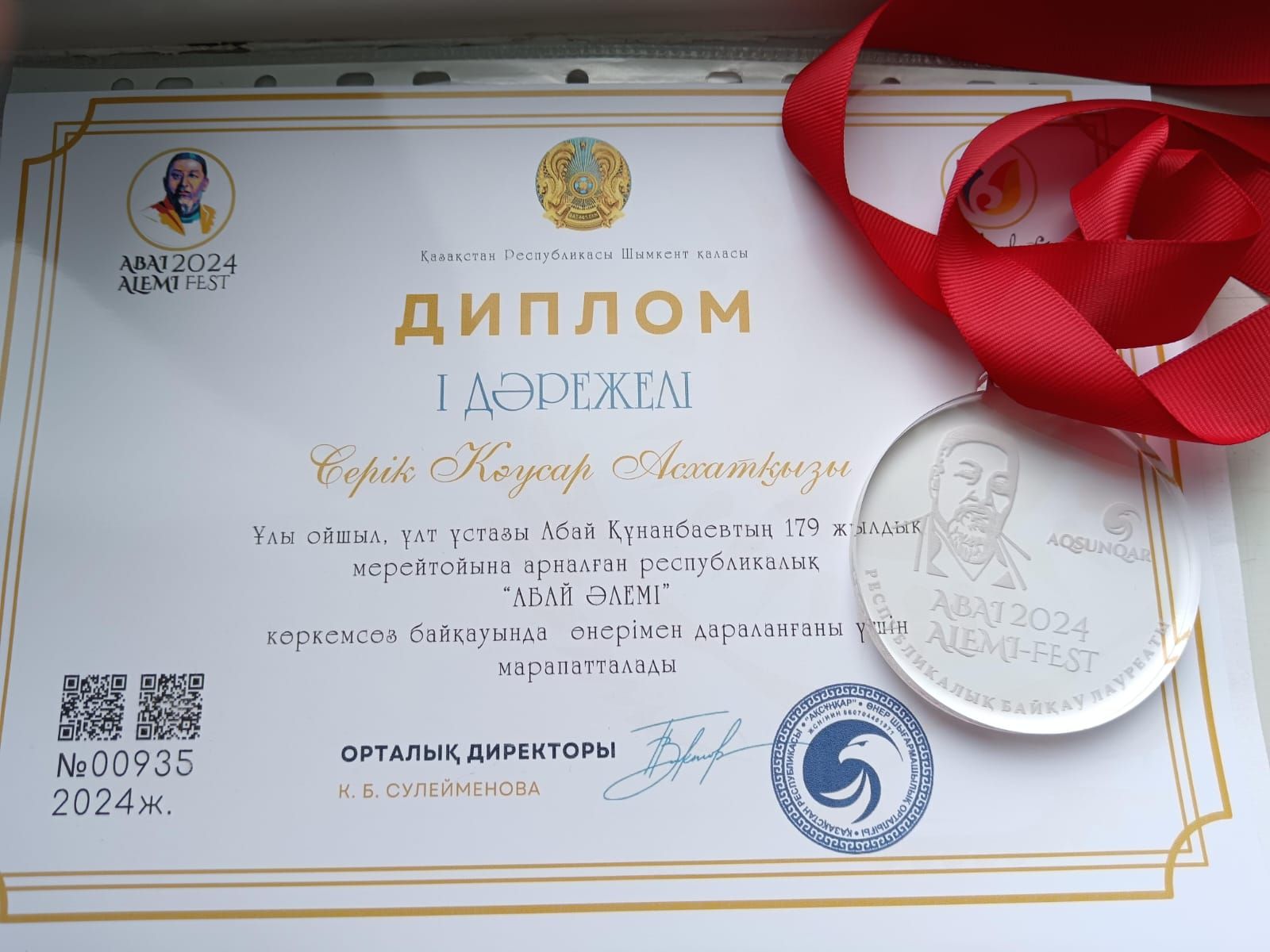 Ұлы ойшыл, ұлт ұстазы Абай Құнанбаевтың 179 жылдық мерейтойына арналған республикалық «Абай әлемі» көркемсөз байқауында өнерімен дараланған 4«Ә» сынып оқушысы Серік Кәусар I дәрежелі диплом жеңімпазы.