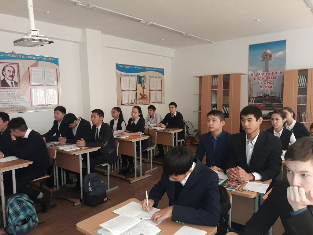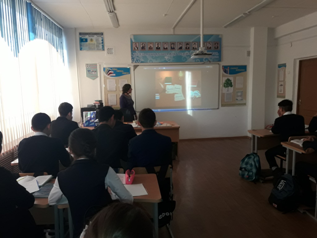 Қазақ тілі мен әдебиеті пәні мұғалімі Байманова Райгүл Базылқызы 10-сынып оқушыларымен тәжірибе алмасу сабағын өткізді. Сабақтың тақырыбы: Ыбырай Алтынсарин өмірі мен шығармашылығы Сабақтың мақсаты: Ыбырайдың өмірі мен шығармашылық қызметі туралы баяндай отырып, қазақ әдебиетінің жанрды қалыптастырушысы болғанын айту. Сабақтың міндеттері: 1. Ыбырай әңгңмелерін оқушыларға қысқаша мазмұндата отырып, аз суретпен көп мағына аңғартатындығын әрі олардың шынайы өмірден алынғандығы - нына назар аударту. 2. Оқушының ой еркіндігін эстетикалықсезімін ояту, әңгімелердегі көркем сөз айшықтарын ұғындыру, қысқаша мазмұндату арқылы тіл дамыту, сөйлеу мәдениетін қалыптастыру. 3. Оқушыларды Ыбырай әңгімелеріндегі кейіпкерлердің жақсы мінез - құлық, орынды іс - әрекеттерән талдау арқылы адамгершілікке, адалдыққа, мейірімділікке қамқорлық жасауға баулу. 1.Оқушылар бейнежазбаны көріп, керекті ақпаратты өздері дәптерлеріне жазып отырды. 2.Оқушылар үйге берілген тапсырма бойынша жоба қорғады. ( ақынның отбасы, балалық шағы, қазақ хрестоматиясы туралы мәлімет айтты).
