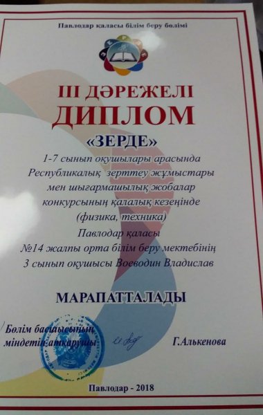 Вовидин Владислав (3-А сынып) - 3 орын (жетешісі Деревнина О.И.), 