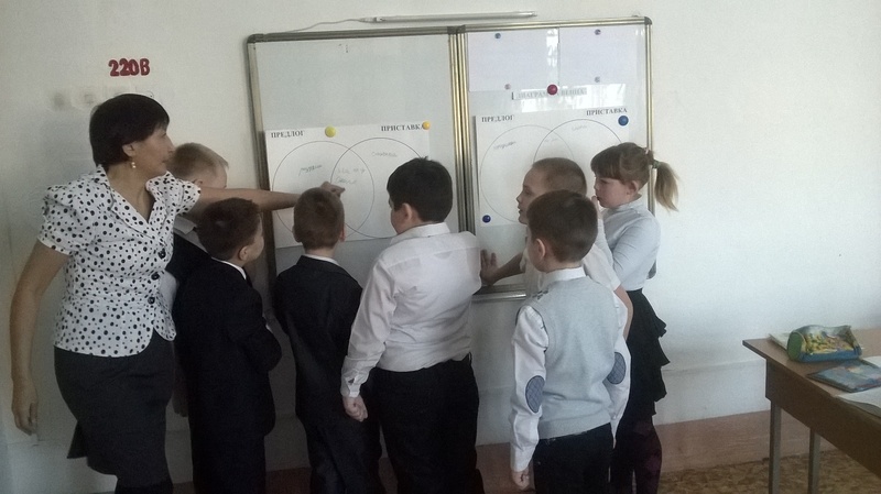 Во 2 «Б» классе прошел урок русского языка по теме: «Правописание предлогов и приставок». Дети с интересом работали в парах, в группе. Новой формой работы для них явилось использование приема критического мышления, а именно работа детей по Диаграмме Венна, которая им очень нравится. Одним из самых ярких запоминающихся моментов, для них была слайдовая презентация.
