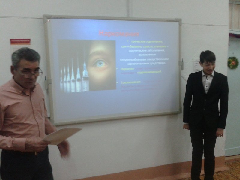 Желтоқсанның 24-куні 9 «б» сыныбында «Нашақорлыққа жол жоқ» тақырыпты сынып сағаты өткізілді. Бұл сабақта оқушылардың қысқы демалысқа шығуы ескеріліп, келесі мақсат көзделді. Оқушыларды өмірдегі, тұрмыстағы келеңсіз жағдайларға – нашақорлықпен айналысып, өзін - өзі айықпас дертке душар етудің алдын алуға, күресуге шақыру.Нашақорлықтың ЖҚТБ (ВИЧ СПИД) – ауруын жұқтырудың бірден – бір жолы екенін, ЖҚТБ ауруының кеселді жақтарын, соңы өлуге дейін апаратын кесел екенін жан - жақтың ойын дамыта отырып, ондай кеселдерден, дерттен аулақ болуға оның орнына, салауатты өмір салтын құруға баулу.