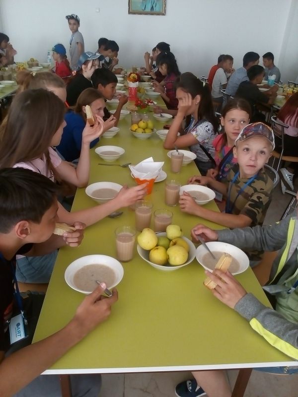 Дети ехали в поезде. Отдыхали, общались за вечерним чаем. Завтракали, обедали, ужинали во дворце школьников в городе Астана.