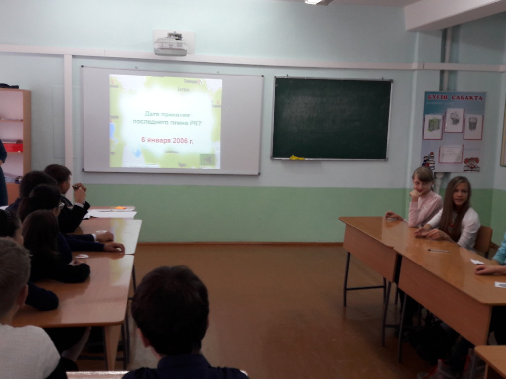 На первом этапе участники – ученики 6 «А» и 6 «Г» класса представили свою команду. Второй тур «Байга» заставил участников игры вспомнить некоторые факты, о государственных символах, о знаменательных датах для нашей республики, о государственных праздниках и о многом другом, что олицетворяет слово «независимость».
