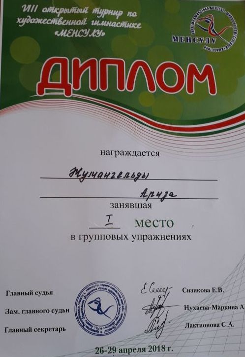 Алматы қаласында өткен Республикалық "Менсулу" көркем гимнастика VIII ашық турнирінен 1 "А" сынып оқушысы Жұмагелді Ариза І, ІІ орынға ие болды.