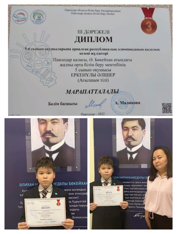 Гуманитарлық бағыттағы 1-ші қалалық жасөспірімдер олимпиадасының жүлдегері, 3-орын 5 «А» сынып оқушысы Еркенұлы Әлішер, ағылшын пәнінің мұғалімі Магжанова Айгуль Оразовна құттықтаймыз!
