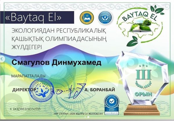 22 декабря 2020 года Республиканским центром «Дарын» была организована Республиканская дистанционная олимпиада по экологии «Baytaq El» среди школьников 9-11 (12) классов организаций образования республики Казахстан. Дистанционная олимпиада по экологии «Baytaq El» проводится с целью повышения экологической грамотности учащихся и стимулирования мотивации познавательных интересов школьников об улучшении состояния среды обитания, живой природы и здоровья. В данной олимпиаде приняли участие учащиеся 9 «Е» класса Кенжекей Анель и 10 «Ә» класса Смагулов Динмухамед и заняли призовые 3 места. Поздравляем ребят с их достижениями! (Алибекова Ж.М.)