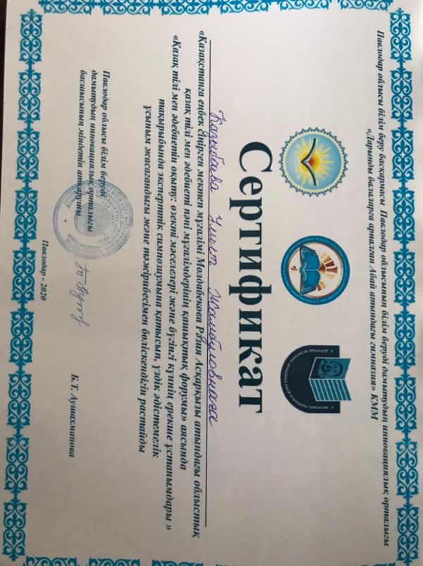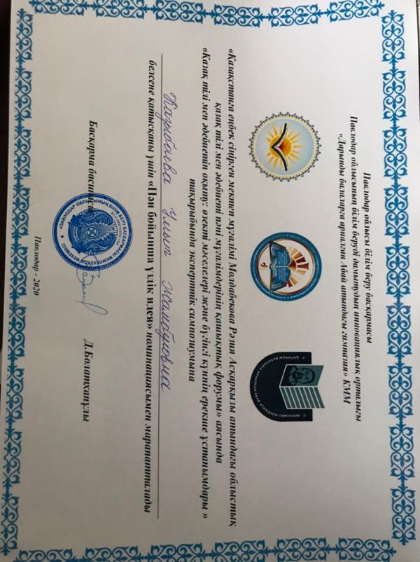 «Қазақстанға еңбек сіңірген мектеп мұғалімі Молдабекова Рәзия Асқарқызы атындағы облыстық қазақ тілі мен әдебиеті пәні мұғалімдерінің қашықтық форумы» аясында «Қазақ тілі мен әдебиетін оқыту: өзекті мәселелері және бүгінгі күннің ерекше ұстанымдары» тақырыбында эксперттік симпозиумына қатысып, үздік әдістемелік ұсыным жасағандығы және тәжірибесімен бөліскендігі үшін Смагулова К.С, Казыбаева У.Ж сертификатқа және «Пән бойынша үздік идея» номинациясына ие болды.