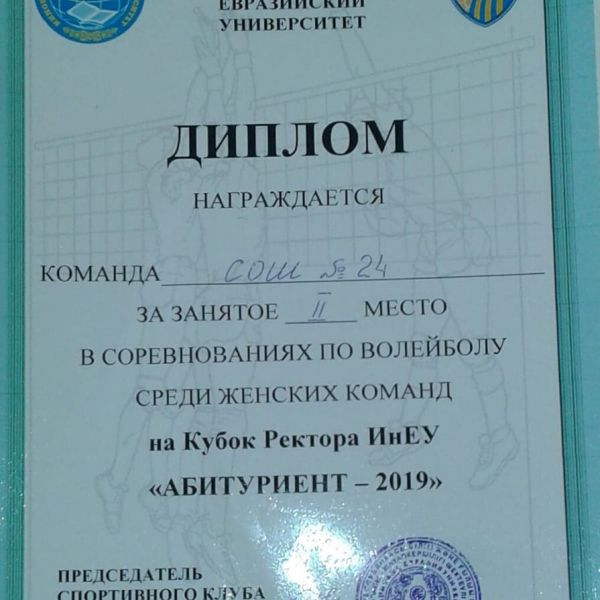 Сегодня учащиеся СОШ 24 заняли 2 место в соревнованиях по волейболу среди женских команд на Кубок ректора ИнЕУ. Тренер Машгутов Р.К. Поздравляем наших победителей!