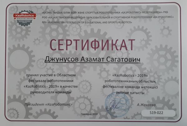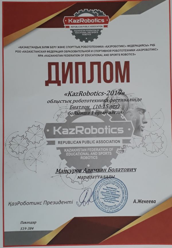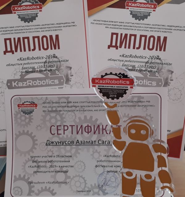 Сегодня на базе ПКТиК прошел Областной фестиваль робототехника “KazRobotics-2019” на котором СОШ №24 представили учащиеся 5 класса Сидоров Никита и Мансуров Алимхан. Мы поздравляем ребят с 1 местом и путевкой на Чемпионат Казахстана по робототехнике, который будет проходить в городе Шымкент. Учащихся подготовил учитель по робототехнике Джунусов Азамат Сагатович. Поздравляем и желаем дальнейших побед!!!