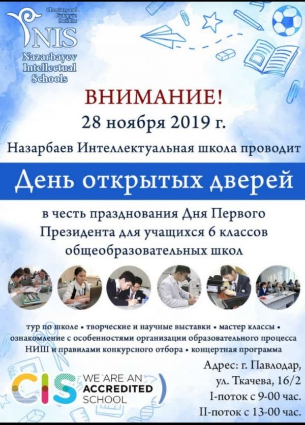 Сегодня в Назарбаев Интеллектуальной школе прошёл день открытых дверей для 6 классов общеобразовательных школ. Ребята из 6 Ж класса побывали на данном мероприятии, посвящённом в честь празднования Дня Первого Президента РК. Мероприятие началось с приветственных слов организаторов, с ознакомления особенностями работы школы, правилами приёма в данную школу и небольшой концертной программой, которую приготовили учащиеся НИШ. Далее учащиеся всех школ разделились на группы и знакомились с работой разных площадок с научными и творческим выставками и мастер классами. Больше всего ученикам понравилось участие в мастер классах. Думаем, что для наших ребят сегодняшний день знакомства с НИШ запомнится на долго.
