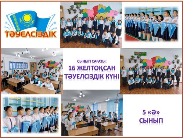 Тәуелсіздік күніне орай 5"Ә" сыныбының қатысуымен "Еліміздің еркіндігі - Тәуелсіздік" атты тәрбие сағаты өткізілді. Оқушылардың патриоттық сезімдері оянып, өте қуанышта болып өтті.