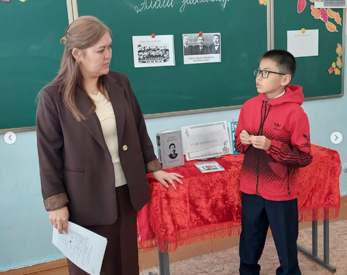 Қазақ тілі пәнінің мұғалімі Сейтахметова Н.Б. мен мектеп кітапханашысы Алдекенова У.М.-мен бірге 5 «Ә», 6 «Ә», 7 «Ә» сынып оқушыларымен «Алаш зиялылары» атты сынып сағатын өткізді.