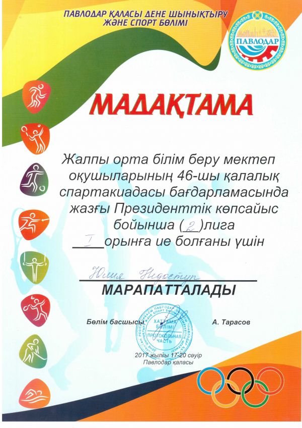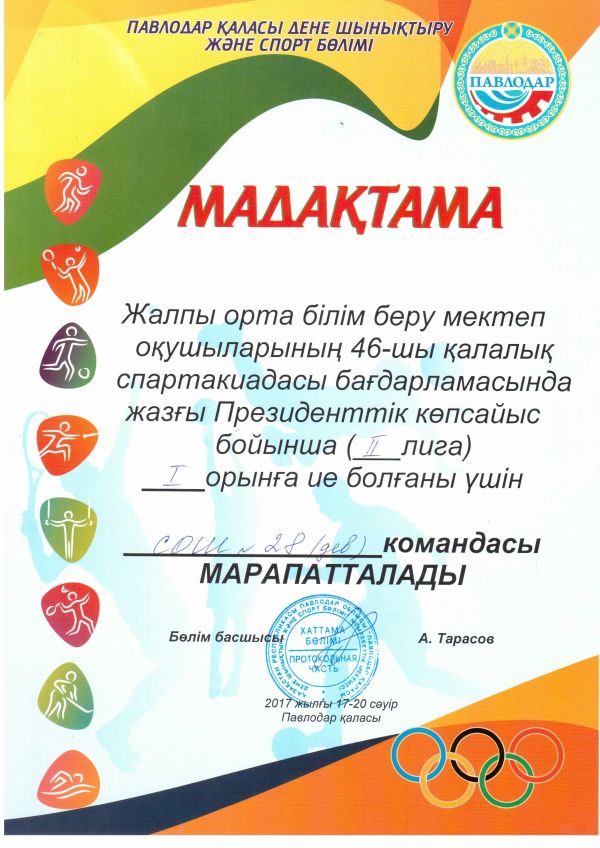17-20 апреля 2017 г. на спортивных аренах города прошли соревнования Спартакиады школьников г. Павлодара по летнему Президентскому многоборью. Кубок победителей завоевала команда девушек СОШ № 28. В личном зачете Недоступ Ю. заняла 1 место, Ткачева А. – 2 место. Юноши заняли 3 место в командном зачете.