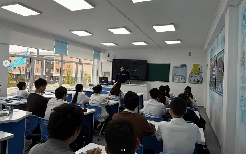 Учаскелік полиция инспекторы полиция капитаны Әлназаров Әкімбек Қанатбекұлы оқушыларымызбен қауіпсіздік шаралары туралы әңгімелесті.
