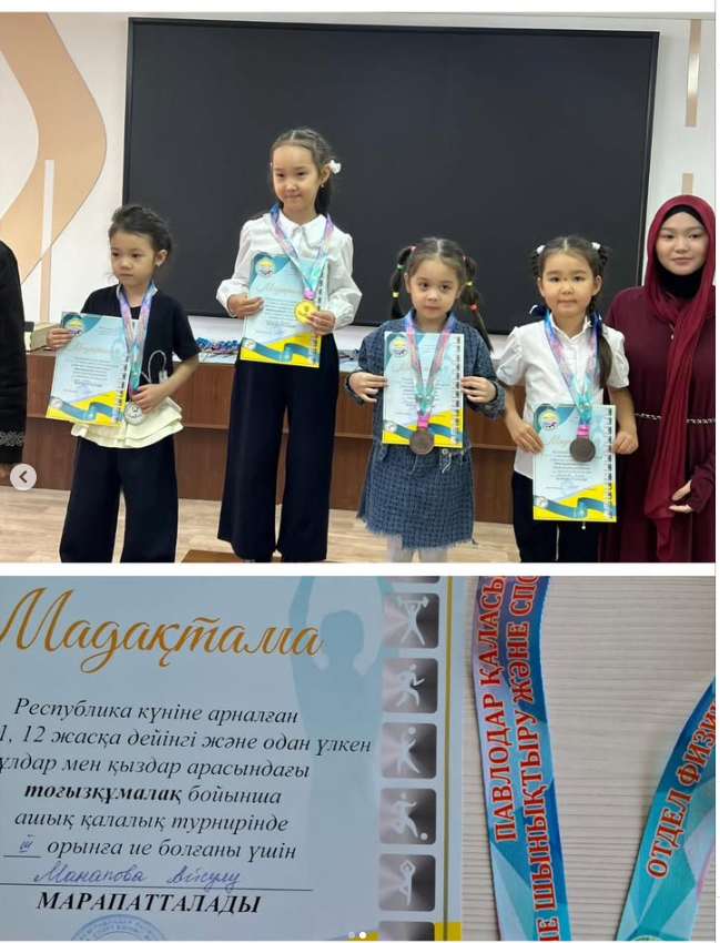 Республика күніне орай тоғызқұмалақ ашық қалалық турнирінде 1”Ә”сынып оқушысы Манапова Айсұлу 3 орын иеленді .Құттықтаймыз!