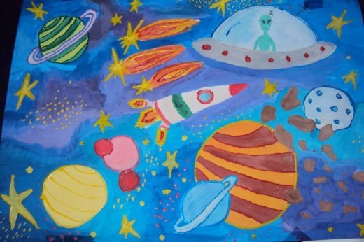 В работах детей отразились и современные представление о космосе, и сказочные, и символические образы .Инопланетяне, изображенные на рисунках , чаще всего выглядели забавными и дружелюбными.