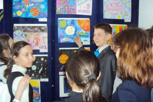К Дню Космонавтики в нашей школе была оформлена выставка рисунков « Я и Космос». Приняли участие учащиеся кружка « Юный оформитель».