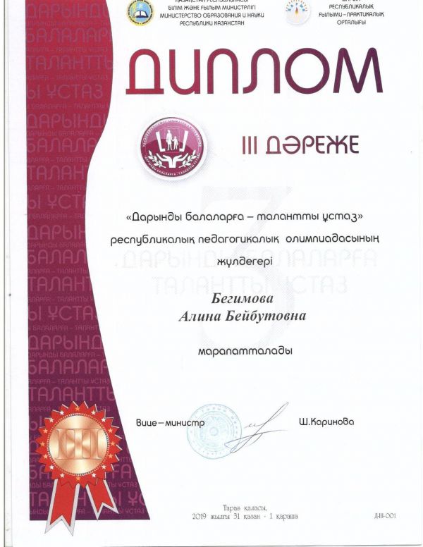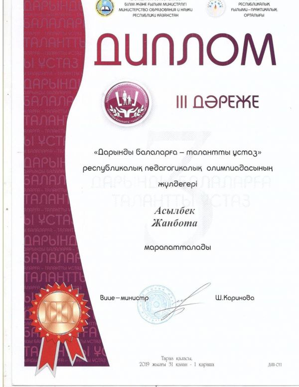 31 октября в городе Тараз была проведена республиканская педагогическая олимпиада «Талантливый учитель – одаренным детям». Учитель математики Бегимова Алина Бейбутовна и логопед-дефектолог Асылбек Жанбота стали призерами олимпиады. Поздравляем коллег!