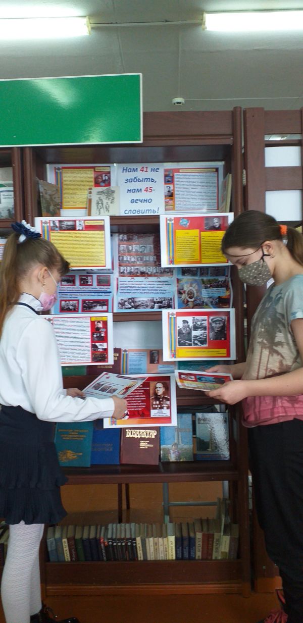 5 мая в библиотеке школы №41 прошел Открытый просмотр книжной выставки «Нам 41 не забыть, нам 45-вечно славить», приуроченный Дню победы в Великой Отечественной войне над фашизмом. На выставке опубликованы материалы о славных подвигах героев Великой Отечественной войны казахстанцев - Ибраима Сулейменова, Абылхаира Баймульдина, Сабыра Рахимова, Маншук Маметовой и многих других. Также ребята познакомились с книгами таких авторов как М.С.Теренник «На защите родных рубежей», «Павлодарцы на полях сражений», Э.Соколкин «В памяти поколений», Б.Хазыров «Чтобы помнили»,М.Каирбаев «Дороги отцов-пути сыновей. О жизни Героя Советского Союза Махмете Каирбаеве», «Подвиг павлодарцев в памяти народной» и других, рассказывающих о самоотверженном подвиге наших земляков- павлодарцев в годы войны.