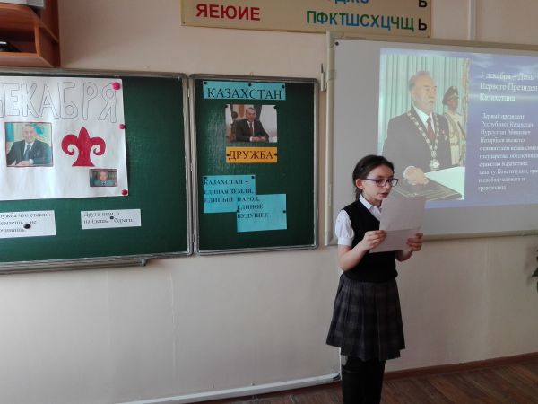 Мектебімізде 1желтоқсан күні Елбасымыз Нұрсұлтан Әбішұлы Назарбаевтың тұңғыш Президент болып сайланған күніне арналған тәрбие сағаты өткізілді. Осы тәрбие сағатына бастауыш сынып оқушылары Елбасына арнаған өлең шумақтарын оқып, Елбасы туралы видеороликті тамашалады.Тәуелсіз еркіндікте өмір сүруге біз қалай жеттік, кімдер арқылы жеттік, деп тарих бетіне үңілсек, ол өте ұзақ жылдар бойы ата-бабамыздың қасық қаны қалғанша аянбай күресіп, елім, жерім, ұрпағым деп балаларым тыныш өмір сүрсін деп бізге тәуелсіз мемлекетті сыйлаған екен. Осындай көп ұлтты мемлекетті басқару 1991 жылы 1 желтоқсанда біздің Елбасымыз Нұрсұлтан Әбішұлы Назарбаевқа бұйырған екен.