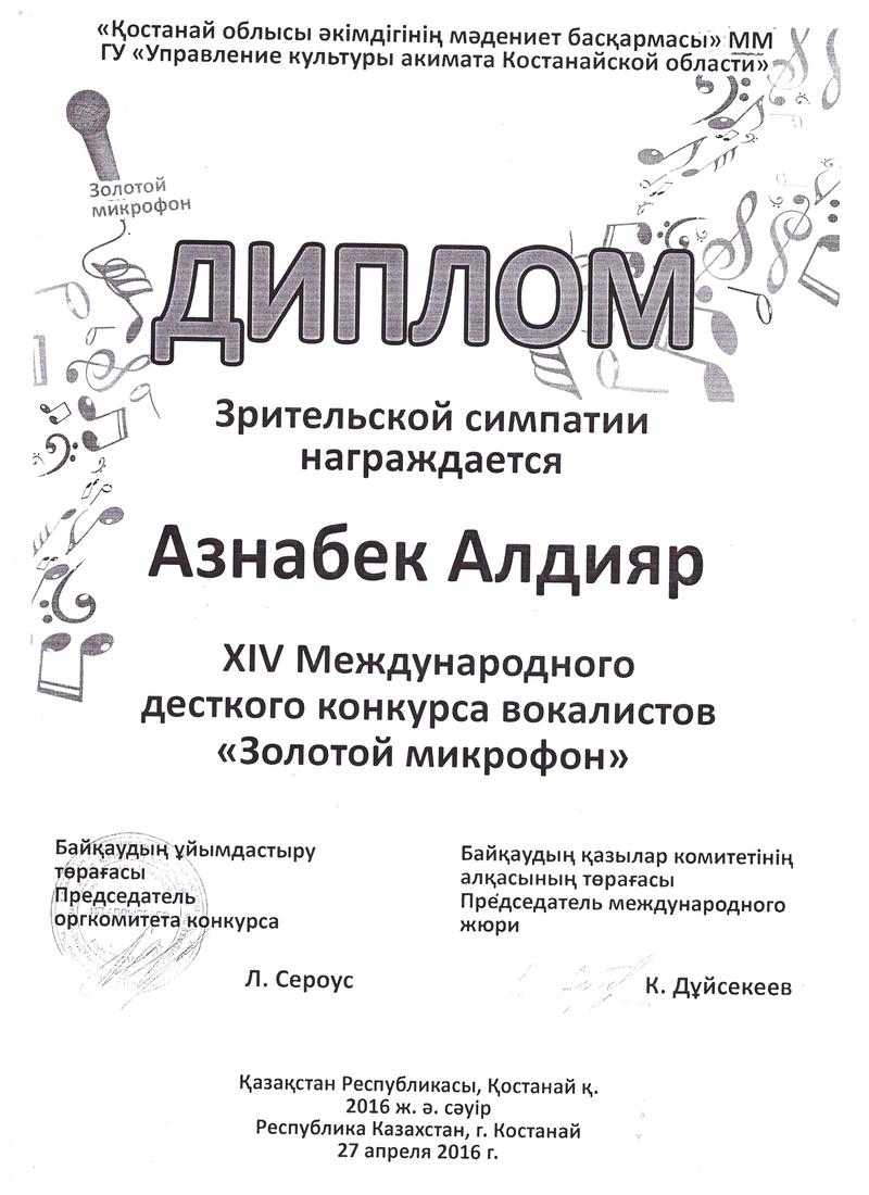 27 апреля 2016 года в городе Костанай состоялся XIV Международный детский конкурс вокалистов «Золотой микрофон». Обладателем диплома лауреата второй степени и диплома зрительской симпатии стал ученик 6 класса «В» СОШ № 43 Азнабек Алдияр. Поздравляем с победой!!! Желаем новых творческих побед!!!