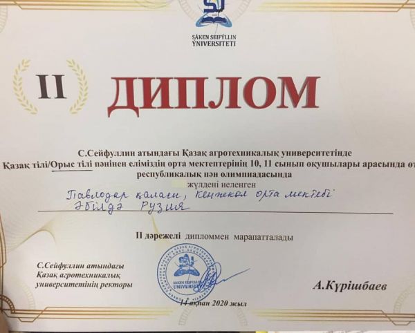Қазақ агротехникалық университетінің базасында қазақ тілінде оқитын 10, 11 сынып оқушылары арасында орыс тілінен Республикалық пән олимпиадасында ІІ орын алған Кенжекөл ЖОМ 10 сынып оқушысы Әбілдә Рузияны, сондай-ақ, оның жетекшісі Аринова Динара Холдаровнаны құттықтаймыз!