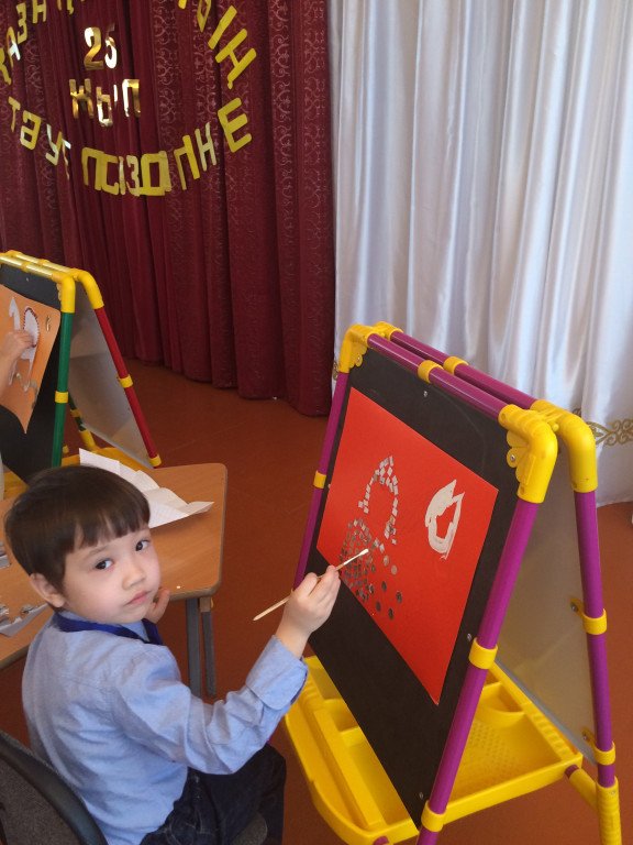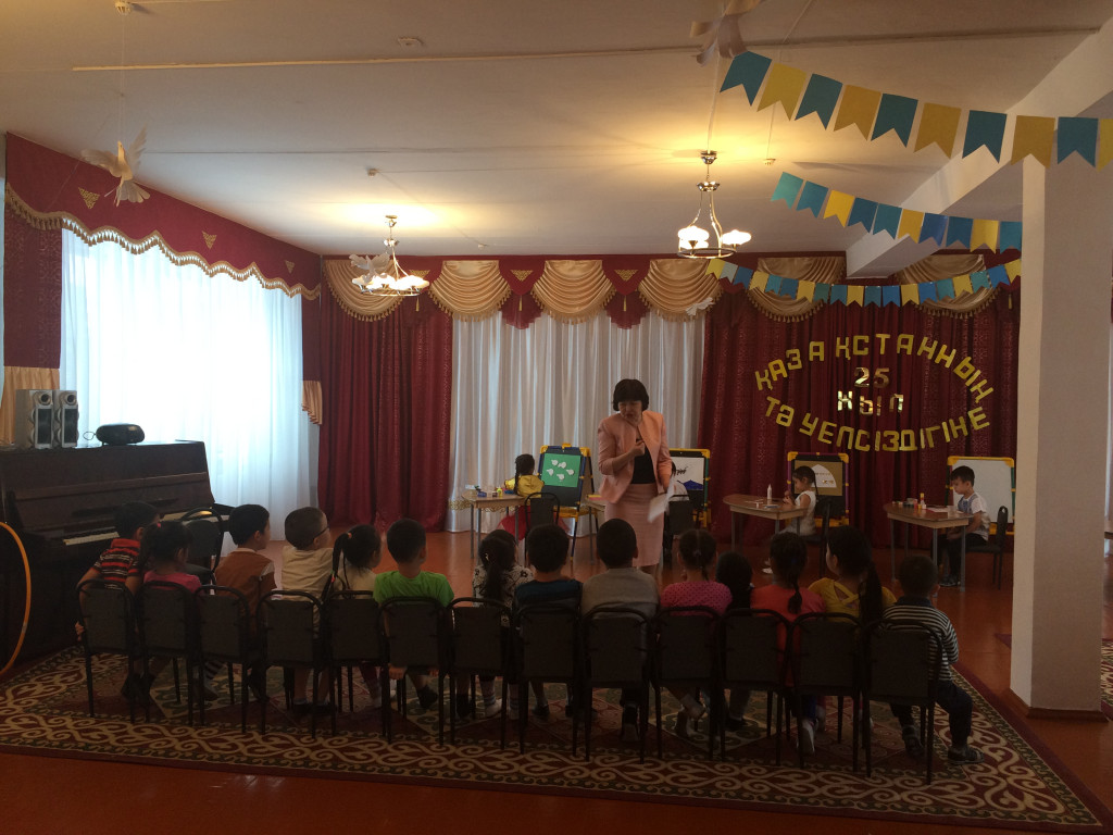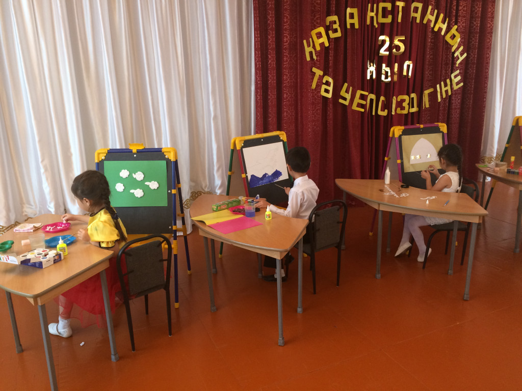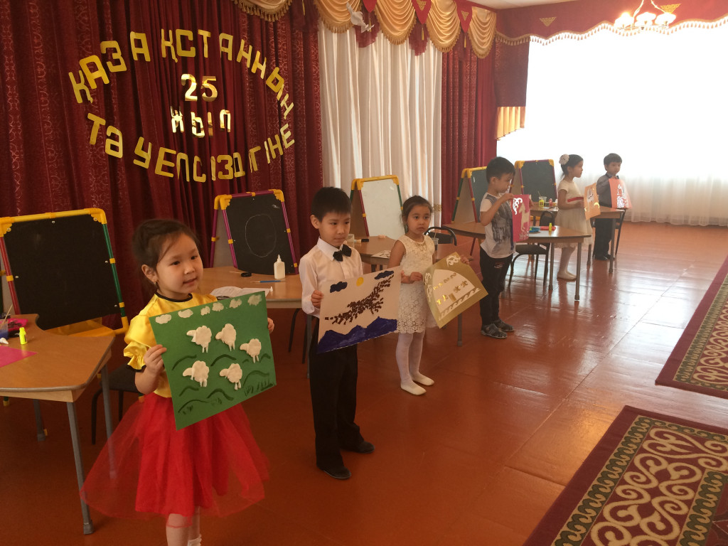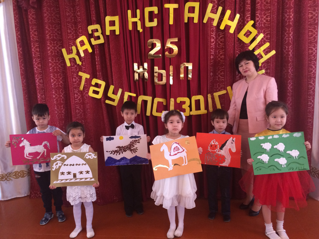 Қазақстанның Тәуелсіздігіне 25 жыл мерекесіне арналған "Тәуелсіз елім-Қазақстан" атты балалардың шығармашылық жас суретшілер байқауы өткізілді. Байқауға ересек және даярлық топтарынан 6 бала қатысты.Олар: Инербаев Аршат,Ахметжанов Али,Бахтыбай Адель,Болат Айсұлу,Сәкен Мәди,Кокешова Даяна. Әр бала берілген тақырыпқа байланысты дәстүрден тыс тәсілдермен сурет салды.Балалар "Ақ тұлпар","Киіз үй","Қыран құс-Бүркіт","Жайлауда","Ақ бота","Қазақ батыры" атты тақырыптарына өте әдемі,ұқыпты,көзді қуантатын өз қиялдарымен суреттерді салып байқауға қатысты. Қалған топ балалары өлеңдерін оқып, әндер айтты және сұрақтарға жауап берді.Балалар өз еліне,өз халқына,туған жеріне деген құрмет сезімдерін білдірді. Осындай іс-шаралар балалардың патриоттық сезімдерін оятып,өз Отанына деген сүйіспеншіліктерін арттырып мақтанышпен қарауға тәрбиелейді деп сенеміз. Атыңнан айналайын егемен ел, Тәуелсіз күнің бүгін кенеле бер Мерейің 25-жылдық құтты болсын Ғасырдың тойы болшы келе берер. деп жас суретшілер байқауын аяқтады