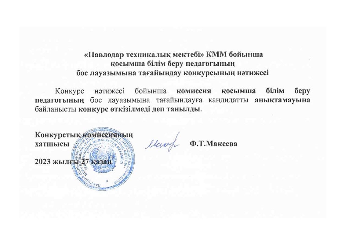 1. заявление об участии в конкурсе с указанием перечня прилагаемых документов по форме согласно приложению 15 к настоящим Правилам; 2. документ, удостоверяющий личность либо электронный документ из сервиса цифровых документов (для идентификации); 3. заполненный личный листок по учету кадров (с указанием адреса фактического места жительства и контактных телефонов – при наличии); 4. копии документов об образовании в соответствии с предъявляемыми к должности квалификационными требованиями, утвержденными Типовыми квалификационными характеристиками педагогов; 5. копию документа, подтверждающую трудовую деятельность; 6. справку о состоянии здоровья по форме, утвержденной приказом исполняющего обязанности Министра здравоохранения Республики Казахстан от 30 октября 2020 года № ҚР ДСМ-175/2020 "Об утверждении форм учетной документации в области здравоохранения" (зарегистрирован в Реестрегосударственнойрегистрации нормативных правовых актов под № 21579); 7. справку с психоневрологической организации; 8. справку с наркологической организации; 9. сертификат о результатах прохождения сертификации или удостоверение о наличии действующей квалификационной категории (при наличии); 10. для кандидатов на занятие должности педагогов английского языка сертификат орезультатах сертификации по предмету или удостоверение о наличии квалификационной категории педагога-модератора или педагога-эксперта, или педагога-исследователя, или педагога-мастера (при наличии) или сертификат CELTA ( Certificate in English Language Teaching to Adults. Cambridge) PASS A; DELTA (Diploma in English Language Teaching to Adults) Pass and above, илиайелтс(IELTS) – 6,5 баллов; илитойфл(TOEFL) (іnternet Based Test (іBT)) – 60 – 65 баллов; 11. педагоги, приступившие к педагогической деятельности в организации технического и профессионального, послесреднего образования на должности педагогов по специальным дисциплинам и мастеров производственного обучения, имеющие стаж работы на производстве по соответствующей специальности или профилю не менее двух лет освобождаются от прохождения сертификации. 12. заполненный Оценочный лист кандидата на вакантную или временно вакантную должность педагога по форме согласно приложению 16. 13. видеопрезентация (самопрезентация) для кандидата без стажа продолжительностью не менее 10 минут, с минимальным разрешением – 720 x 480. |